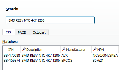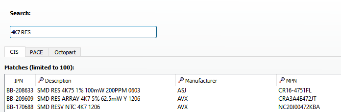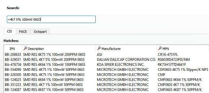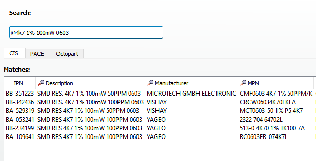 Prefixing the search string with the at symbol indicates an attribute search. The the key attributes are value, rating and tolerance. Any token in the search string and the CIS description field that has a valid format for an attribute is taken as such. E.g. 4K7 is recognised as the value for a resistor, 1% is recognised as a tolerance, 100mW as a power rating and 10V as a voltage rating. All three attributes must be entered. Any addition tokens, e.g. the shape code in the example below are processed in the same way as for a simple search. In this example unwanted results such as 4K75 are excluded.